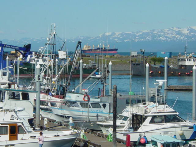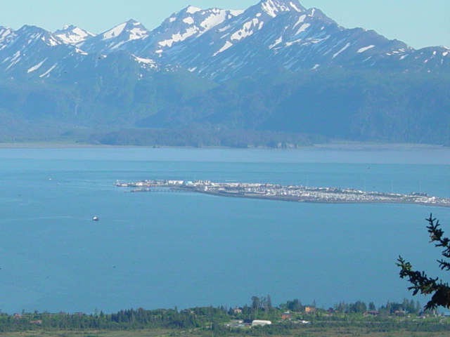 Saturday, June 19 The next two days could have been condensed into one half of a day as far as I was concerned. If you love to fish or eat fish, you may have enjoyed it more, but, I like the phrase, "where's the beef". We stopped in Sodotma for lunch which was ok but not enough to get pictures and then on to Homer on the Spit. A spit is described as as a narrow point of land extending into a body of water. We once again stayed in Bed and Breakfast. Remember what Forest Gump said, "you never know what you are going to get". Our room was certainly not anything to brag about this time and being told to take off our shoes was not the kind of hospitality we are used to in the south. We were assigned the sweetheart room and I thought it was because Laura and I had been sweethearts for 47 years. But the real reason was the room was so small, we had to put our arms around each other and turn around at the same time. It was the smallest bedroom we had slept in since our days in the trailer at Virginia Tech. The views from Skyline Drive of the Spit were very good and I did see a moose as I went out the door early one morning, so the two days were not all that bad.