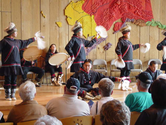 Friday, June 18 On Friday, June 18, we toured the Alaska Native Heritage Center. The center is a place where all people can come to expand their understanding of Alaska's first people. We witnessed the rich heritage of Alaska's eleven cultural groups. We saw the life ways of long ago, the wisdom passed on by elders, and the traditions that have endured. The encounter is designed to enhance self-esteem among Native people and to encourage cross-cultural exchanges among all people. We saw native dances by high school students and saw structures of housing of long ago. Natives were demonstrating crafts, anywhere from basket making to jewelry design and construction. The following pictures were taken at the center.